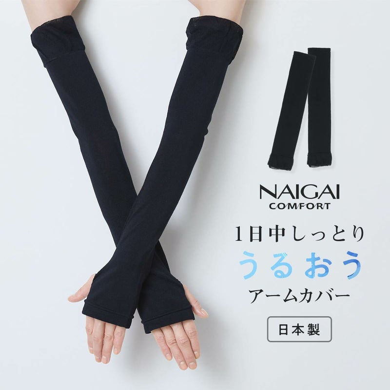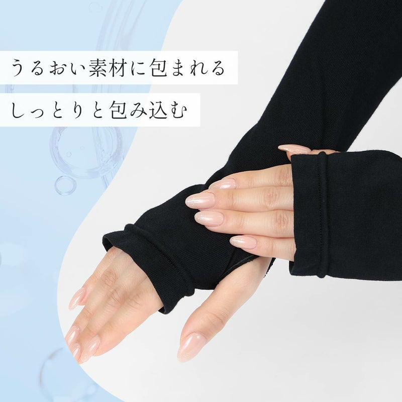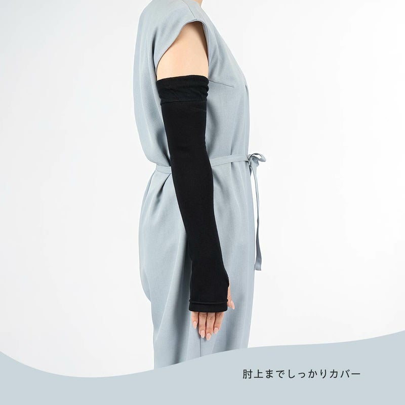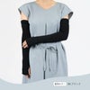 海洋性コラーゲンペプチドが練りこまれている、レーヨン糸 "FILAGEN" を使用した レディース アームカバー です。肘上まで覆える48cm丈。屋外でも室内でも使えるセルフケアアイテムです。冷房対策にもおすすめ。親指穴付きだから、手の甲までしっかり覆えます。