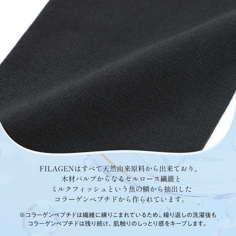 FILAGENは、木材パルプ原料のセルロースと魚のうろこから採れた海洋性コラーゲンからつくられた天然資源由来の繊維です。なめらかな肌ざわり、しっとりとした肌ざわりが特長です。コラーゲンペプチドは繊維に練りこまれているため、繰り返しの洗濯後もコラーゲンペプチドは残り続け、肌触りのしっとり感をキープします。
