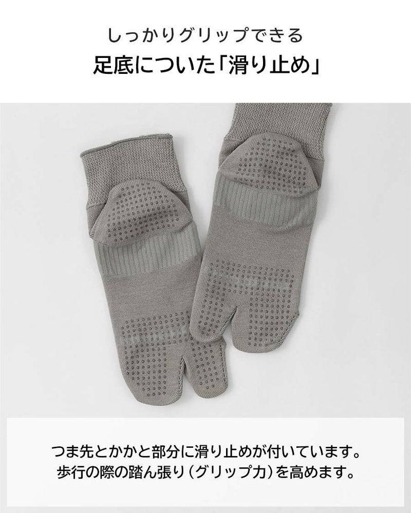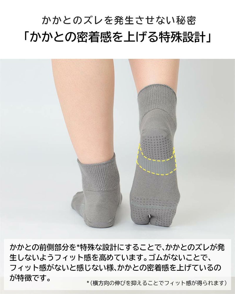 親指とほかの指が分かれることで、足の指先に力が入りやすく、歩行が安定します。しなやかによく伸びる口ゴムでは履き口が痛くなりにくい。かかとのフィット感を高めてズレを防止します。