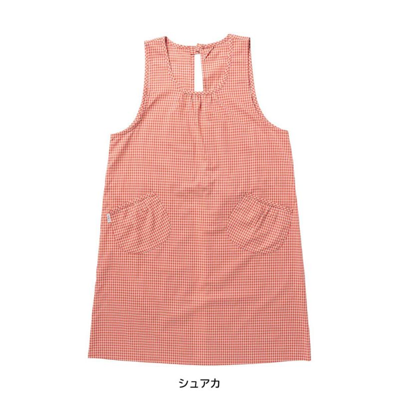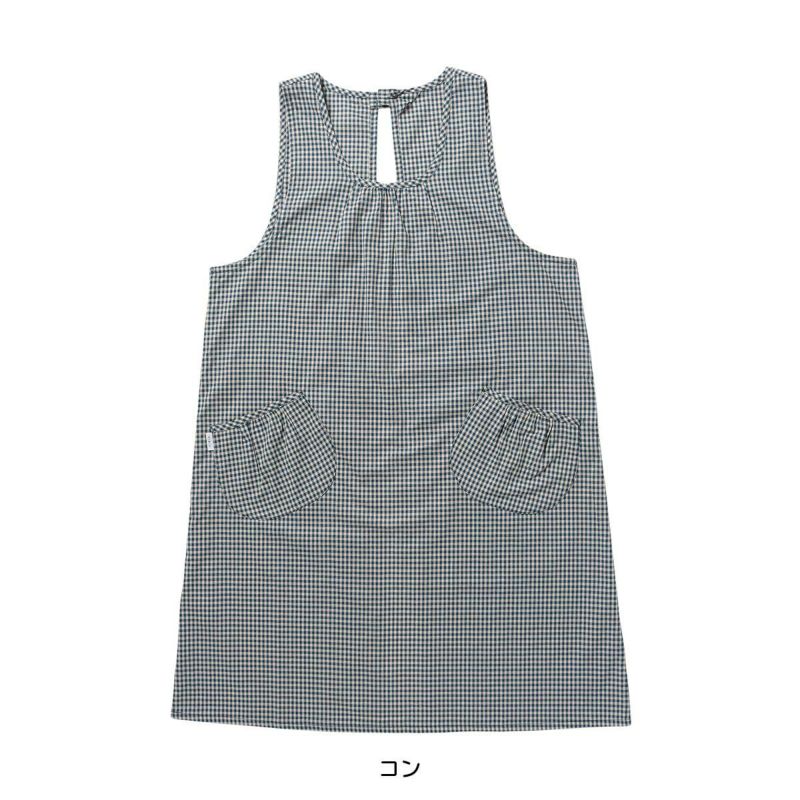 ギンガム柄がシンプルでありながらも洗練されたデザインが魅力の背付きエプロンです。綿100%の素材が柔らかく、快適な着心地です。エプロンの前面には、丸い形が可愛いポケットが2つ付いています。調理中に必要な小物類を収納することができ、作業効率を高めます。また、背面には腰紐があり、ウエストサイズに合わせて調節可能です。