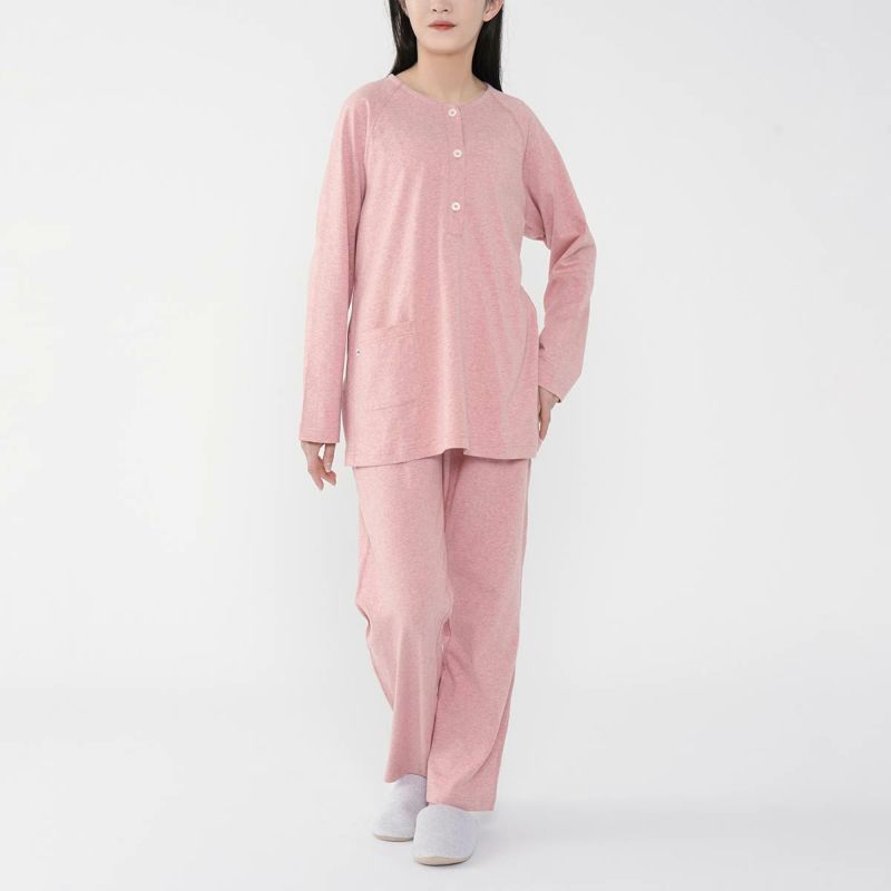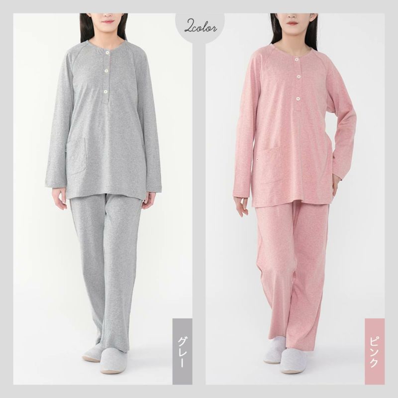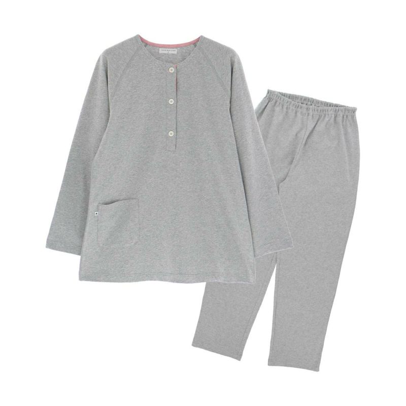 天然素材の綿100%天竺素材の半開パジャマ。無地ベースのシンプルなデザインは、パジャマとしてもルームウェアとしても着用していただけます。