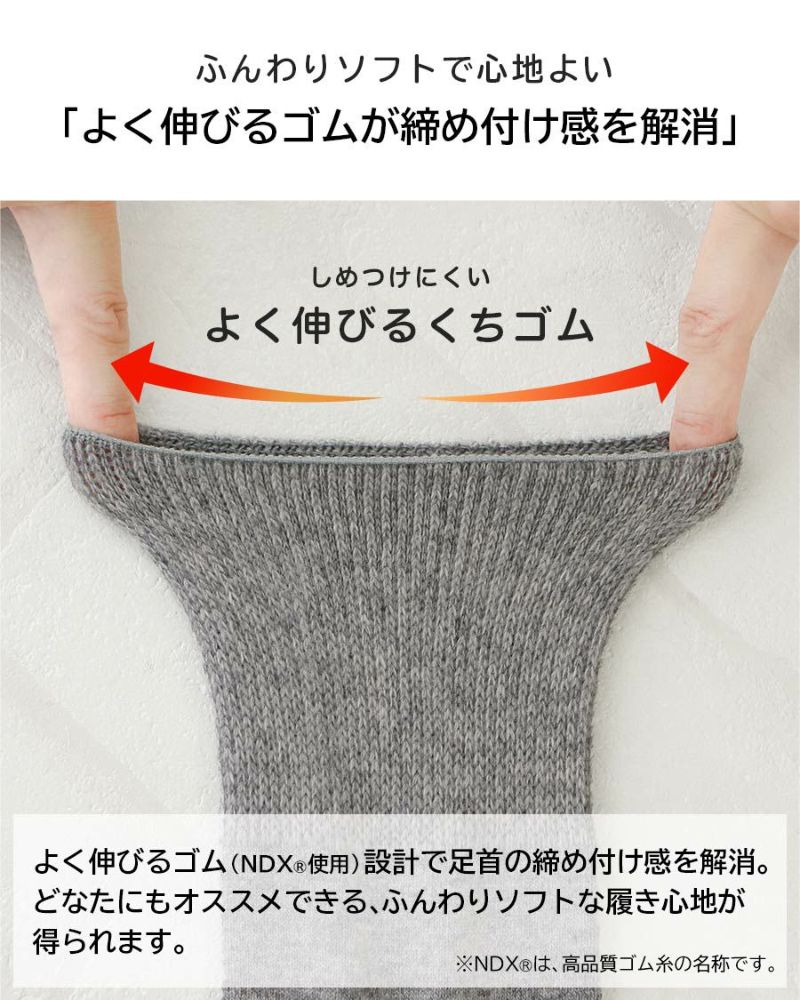 「ふんわり」よく伸びるゴム設計で心地よい締め付け感を実現。どなたにもオススメできる、ふんわりソフトな履き心地。
