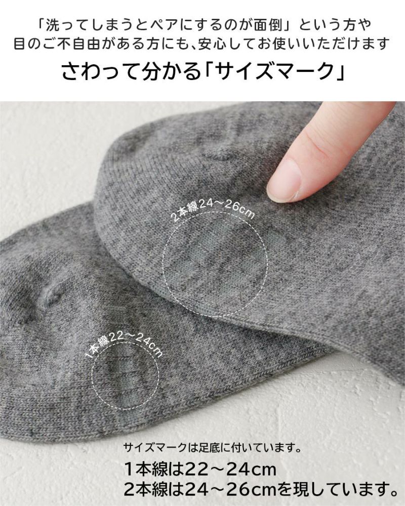 足裏のつま先部分には 触って分かる「サイズマーク」が付いていますので 目のご不自由がある方、お洗濯後に靴下のペアリングが面倒な方も 安心してお使いいただけます。
