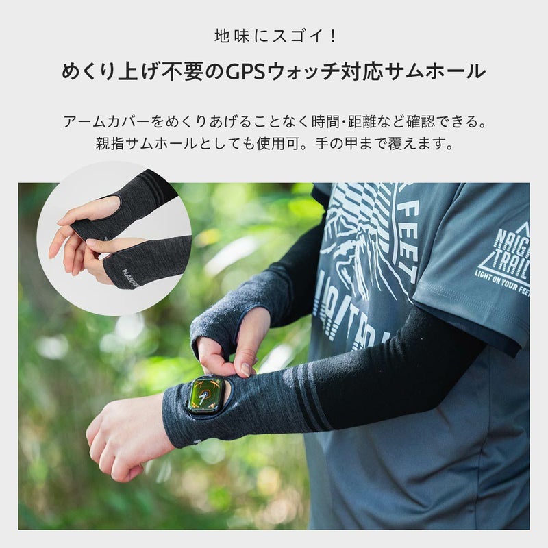 サムホールはあえて大きめの設計。従来の「親指を出す」機能に加え、GPSウォッチの上からかぶせても文字盤が見えるように工夫しています。 手首までしっかり覆いたい時でも、いちいちめくる必要がなくストレスフリー。