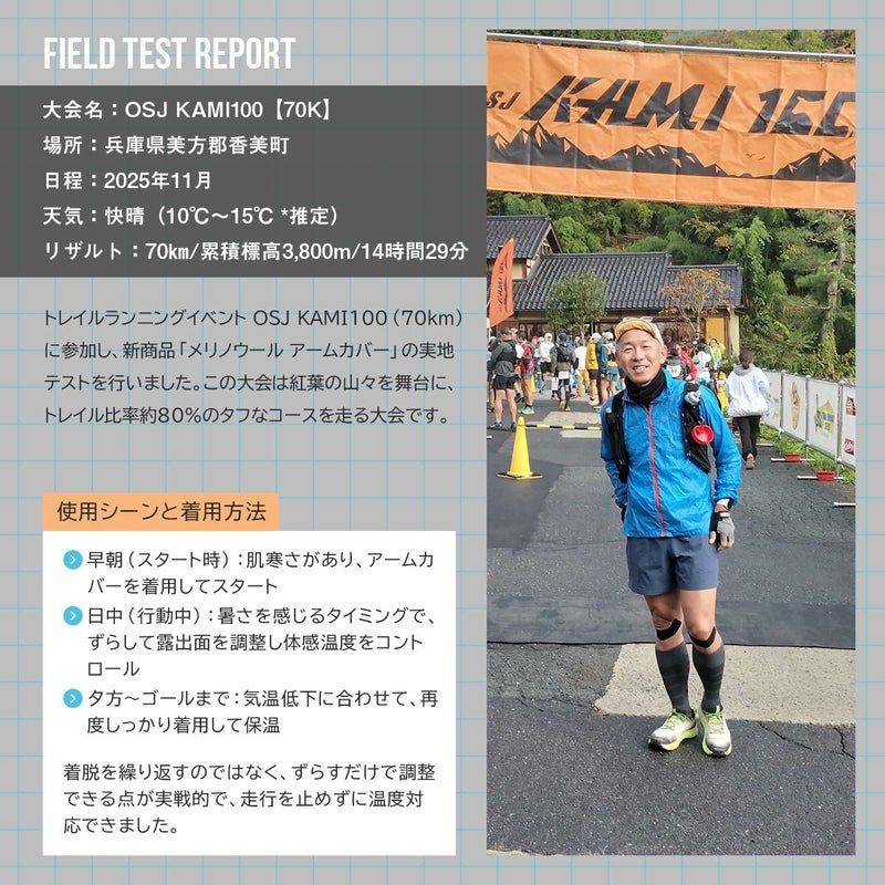 トレイルランニングイベント OSJ KAMI100(70km) に参加し、新商品「メリノウール アームカバー」の実地テストを行いました。この大会は紅葉の山々を舞台に、トレイル比率約80%のタフなコースを走る大会です。
