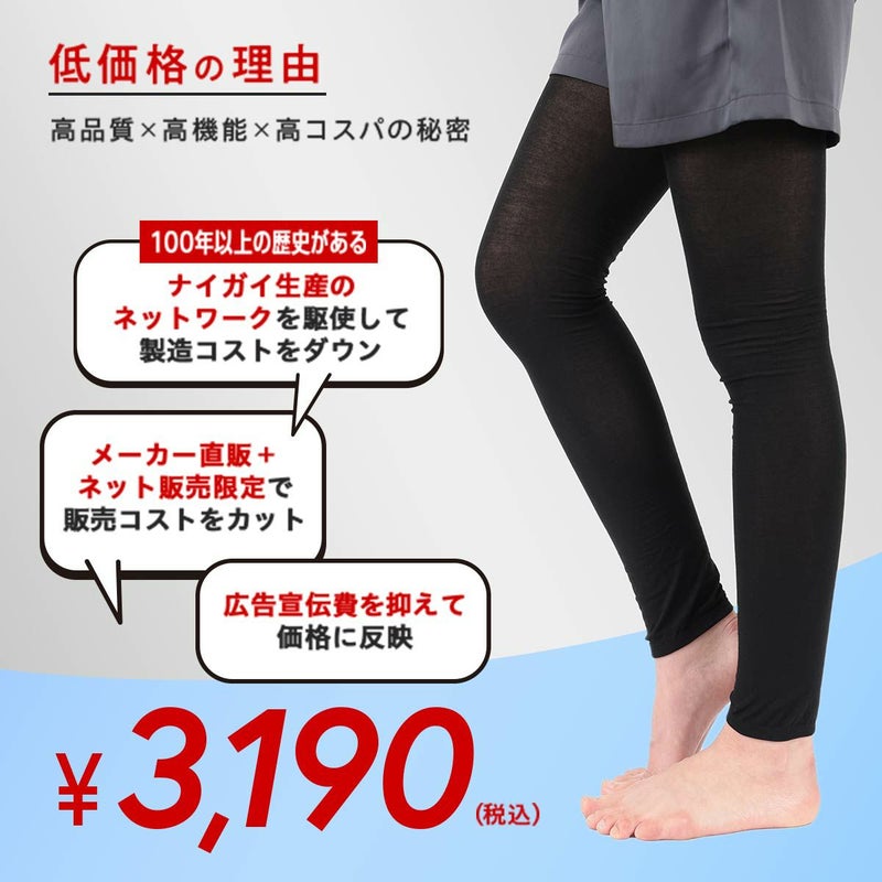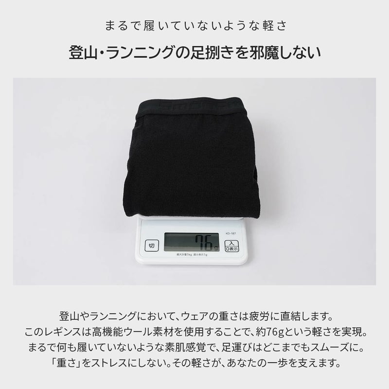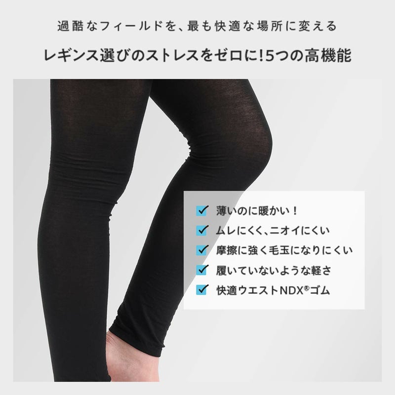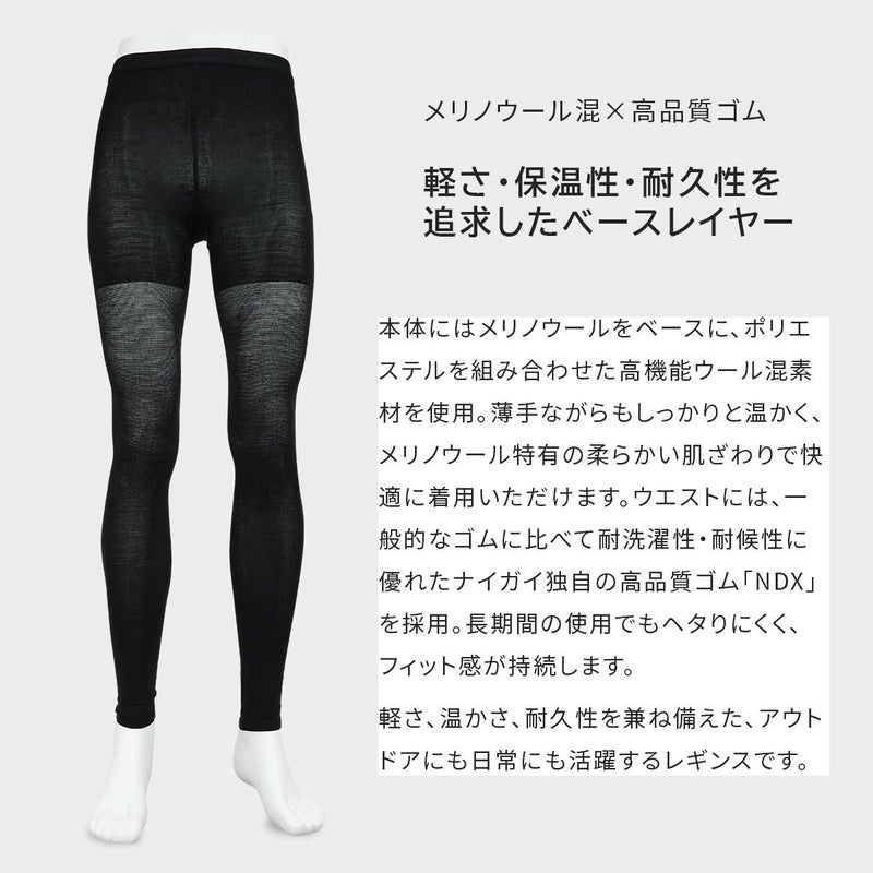 当社(ナイガイ)の靴下と山を愛する社員が企画したレギンスです。メリノウールをベースにポリエステル糸を混紡して機能性を高めた高機能ウール混素材を採用しました。薄手ながらもしっかりと温かく、メリノウール特有の柔らかい肌ざわりで快適に着用いただけます。ウエストには、一般的なゴムに比べて耐洗濯性・耐候性に優れたナイガイ独自の高品質ゴム「NDX〓」を採用。長期間の使用でもヘタりにくく、フィット感が持続します。軽さ、温かさ、耐久性を兼ね備えた、アウトドアにも日常にも活躍するレギンスです。