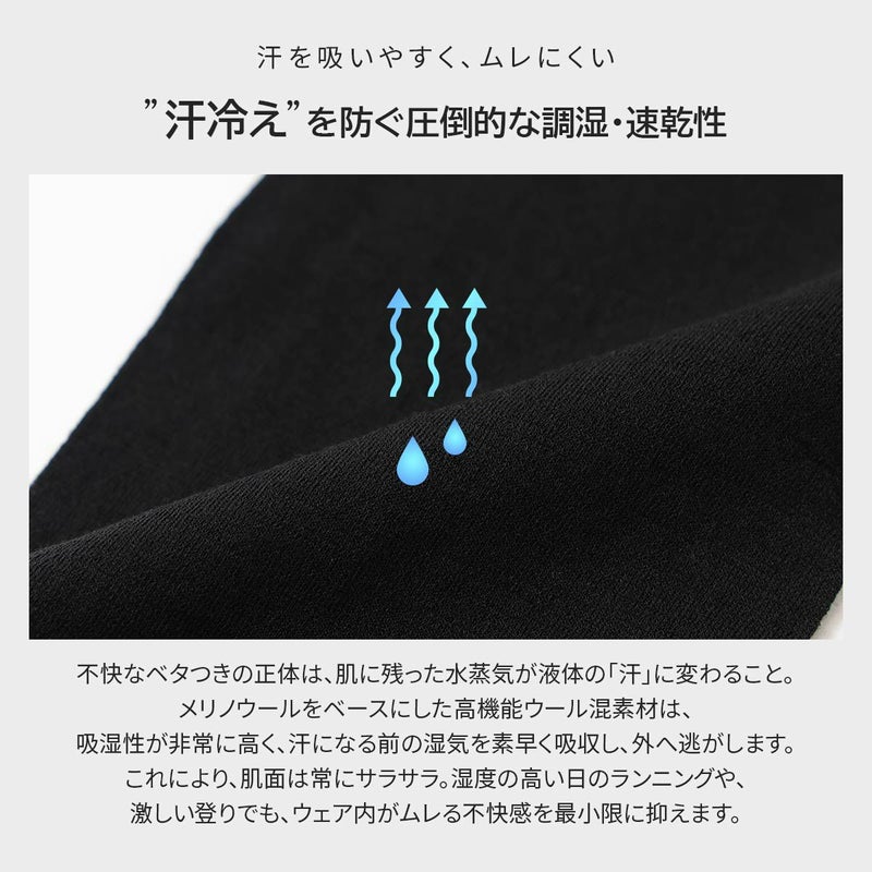 ウールが持つ調湿・防臭力で長時間の行動でもムレやニオイを抑え、内部に配したフィラメント構造が速乾性・耐久性・軽量性をプラス。気温変化の大きい山行でも体温を適切にコントロールし、快適な着用感をキープします。