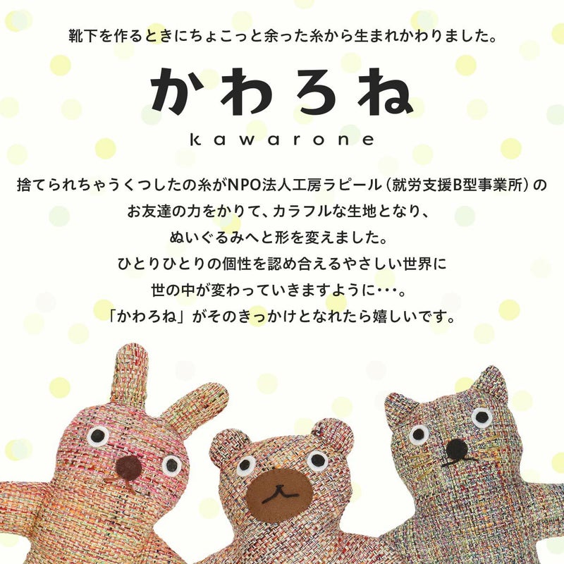 捨てられちゃう糸から生まれた【かわろねちゃん達】 それぞれ いとうさ いとくま いとねこ という名前がついているよ。
