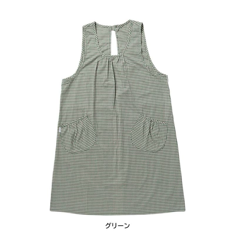 ギンガム柄がシンプルでありながらも洗練されたデザインが魅力の背付きエプロンです。綿100%の素材が柔らかく、快適な着心地です。エプロンの前面には、丸い形が可愛いポケットが2つ付いています。調理中に必要な小物類を収納することができ、作業効率を高めます。また、背面には腰紐があり、ウエストサイズに合わせて調節可能です。