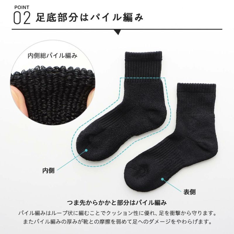 足底部分にクッション性のあるパイル編みを施し、快適な履き心地を提供します。