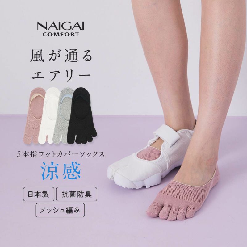 足指と足甲部分が大きなメッシュ編みに。風を通して涼しく履いていただけます。メッシュ編み部:通気性160%(当社比)