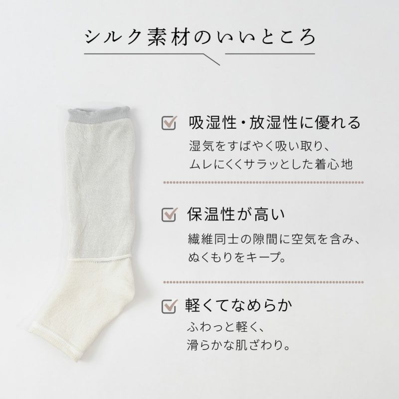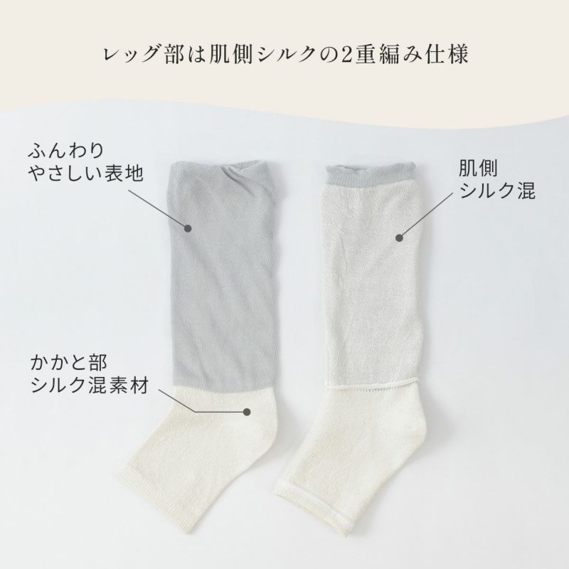 ふくらはぎ部分は保湿性に優れて蒸れにくい肌側シルク混仕様です。
