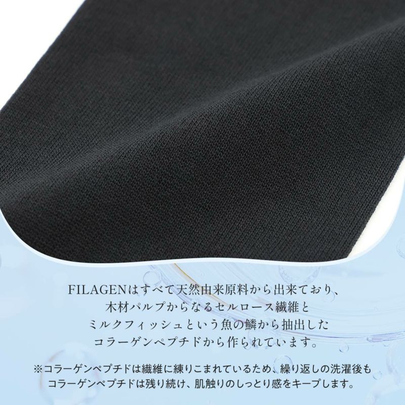 魚のうろこから取れる海洋性コラーゲンペプチドをレーヨン糸に練りこんだ「FILAGEN」を使用。コラーゲンペプチドが皮膚から蒸発した水分を保持し、