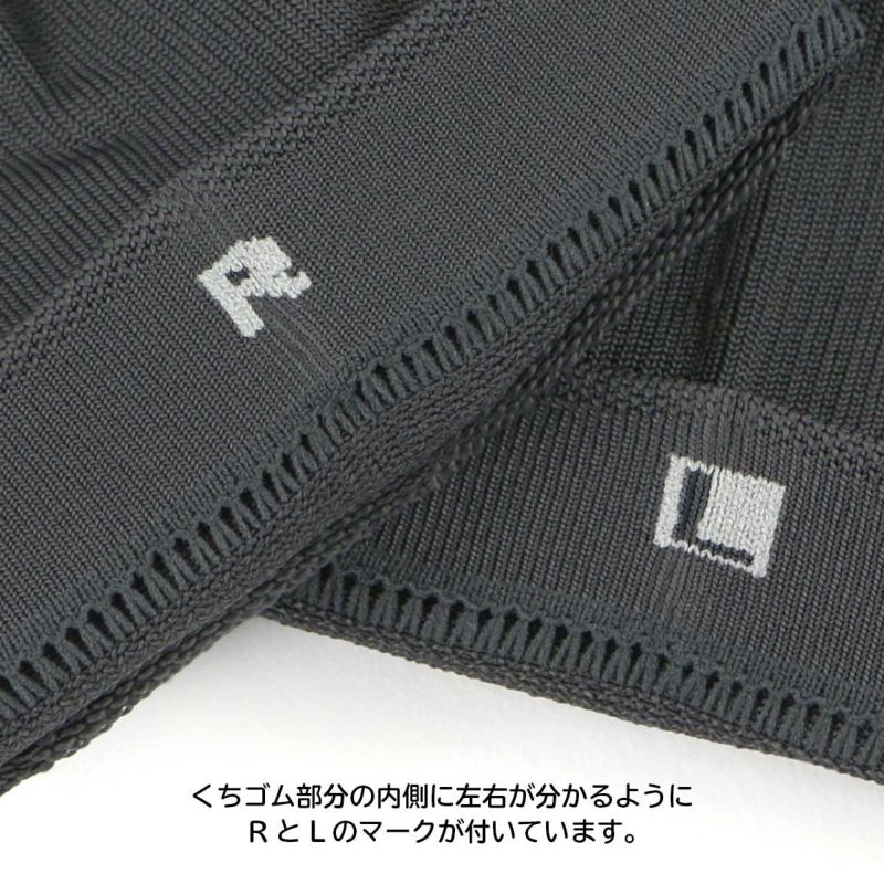 ビジネス ハイソックスは 足のお悩みを和らげる4つの機能「段階圧着設計」「アーチフィットサポート」「ベンチレーションメッシュ」「横アーチ3D編み」が備わっています。長時間運動すると崩れやすいアーチ部分をしっかりサポートし、フィット感を追求した左右設計です。くちゴム部分の内側には 左右が分かるよう「R」と「L」のマークが付いており、お洗濯後に靴下の左右が分からなくなってしまう心配がありません。