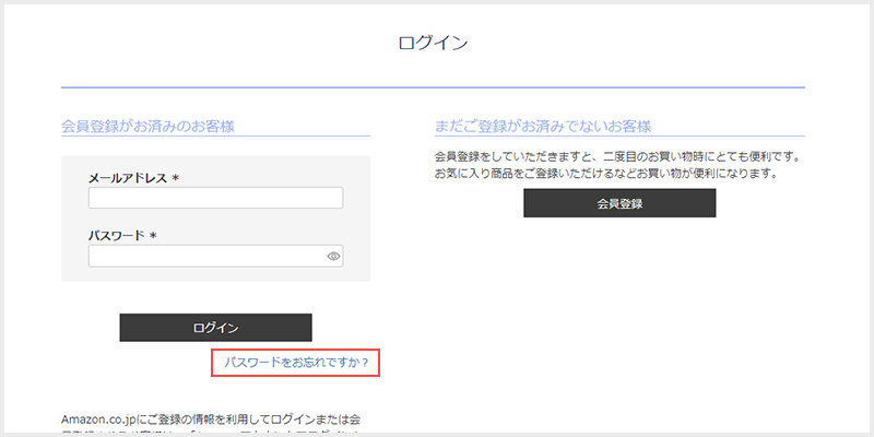 マイページ内の「ログインボタン」右下にある「パスワードをお忘れですか?」ボタンをクリックするとパスワード再設定画面に遷移します。